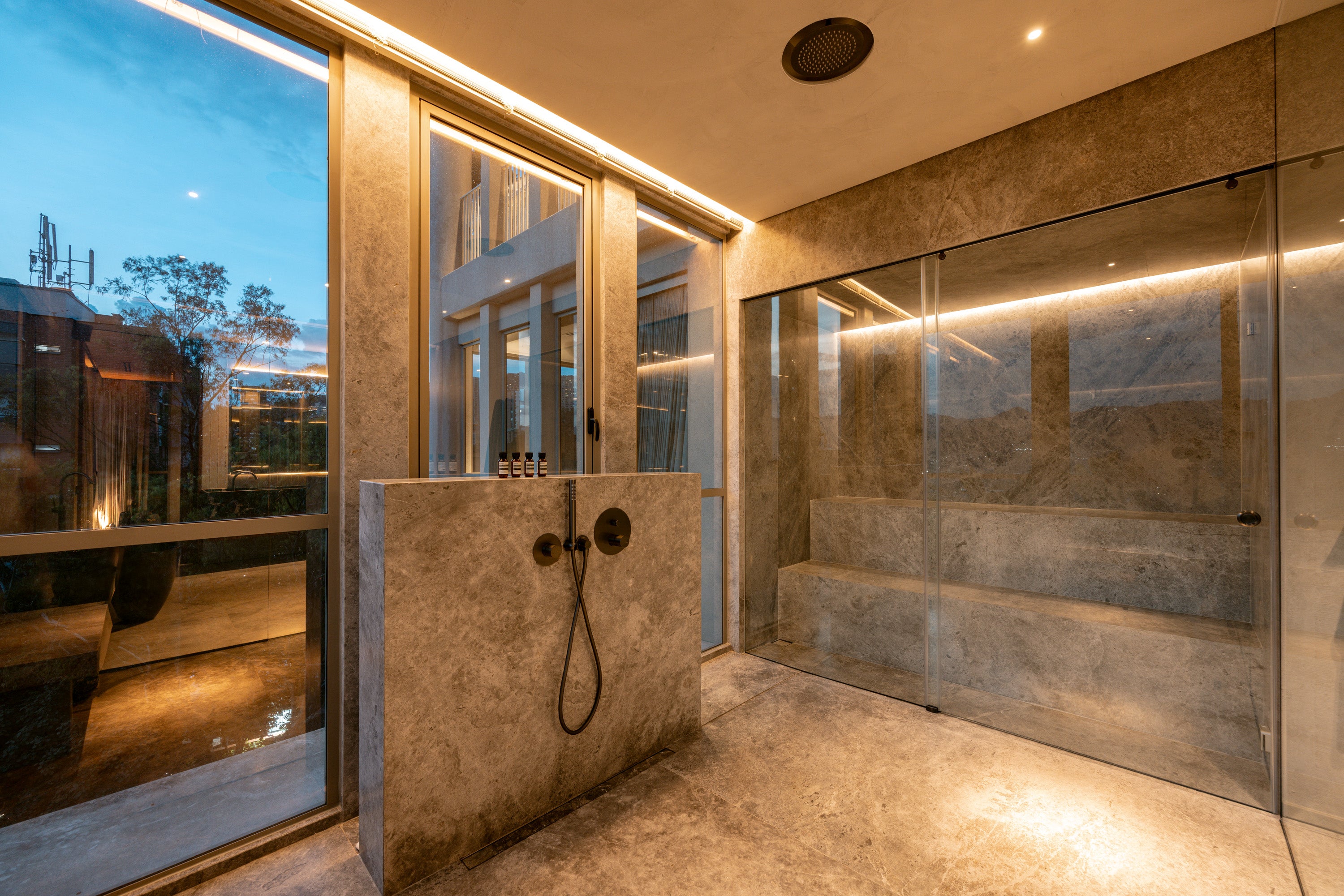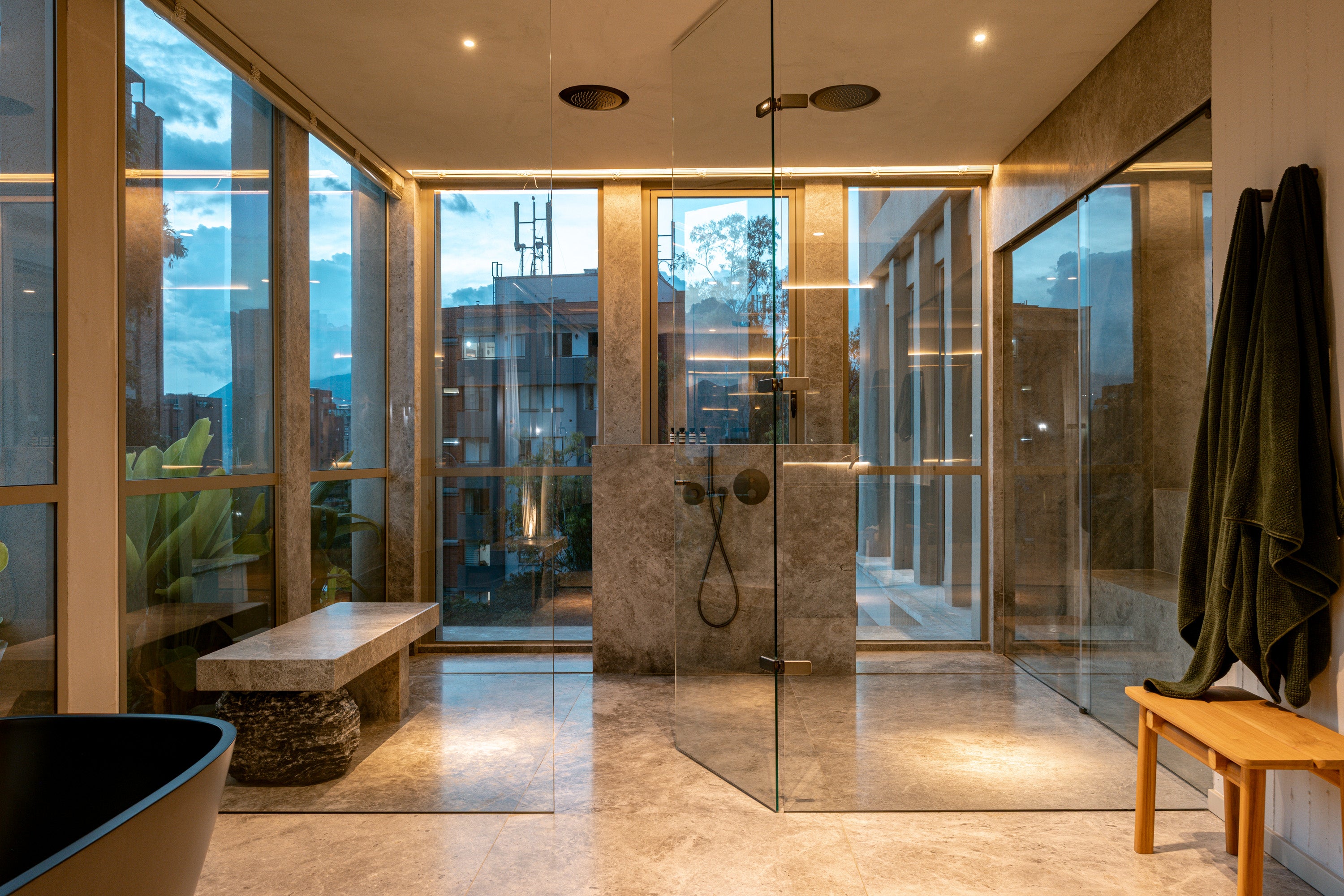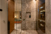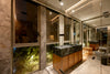 • Acabados en piedra natural, madera, microcemento y sinterizado.
