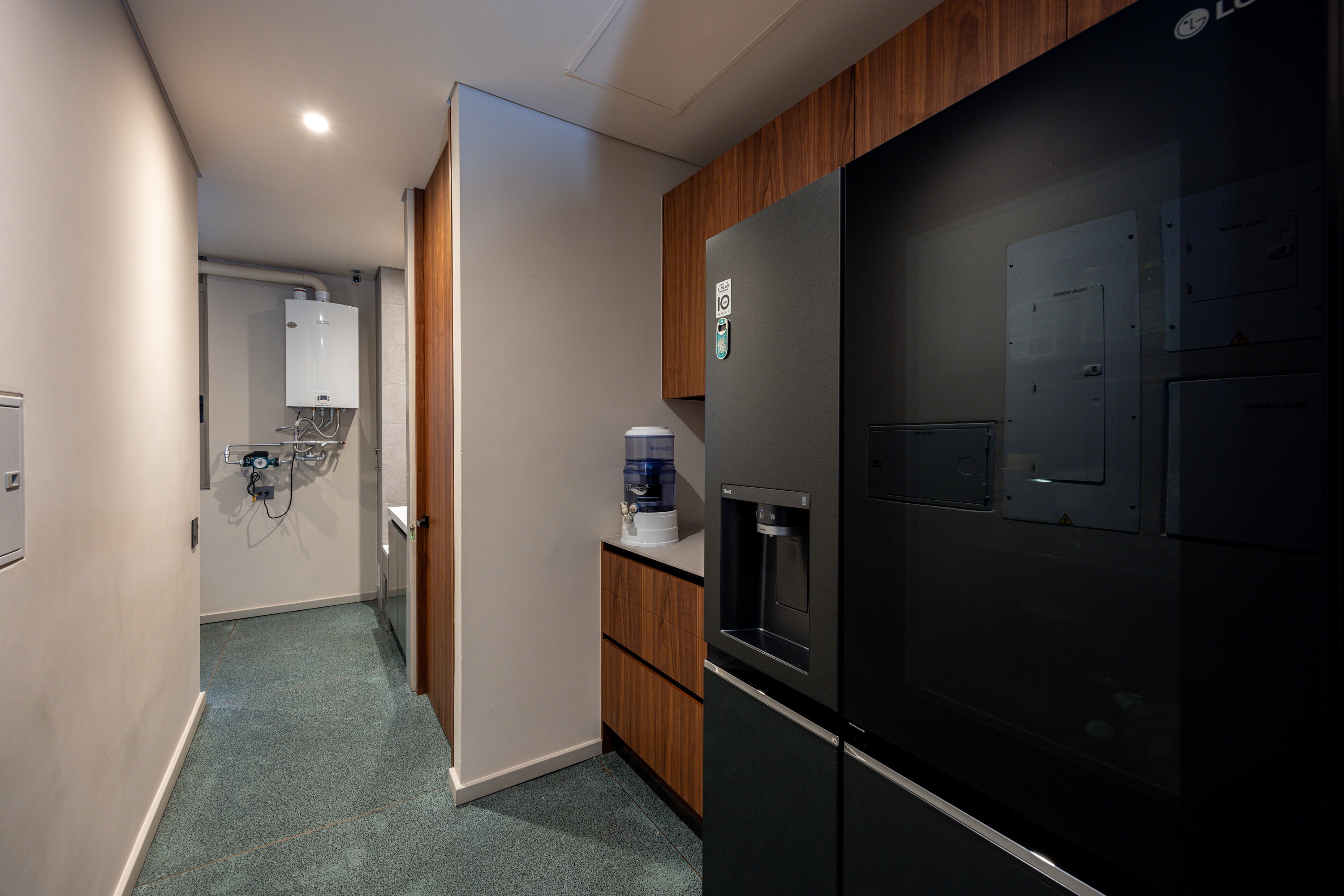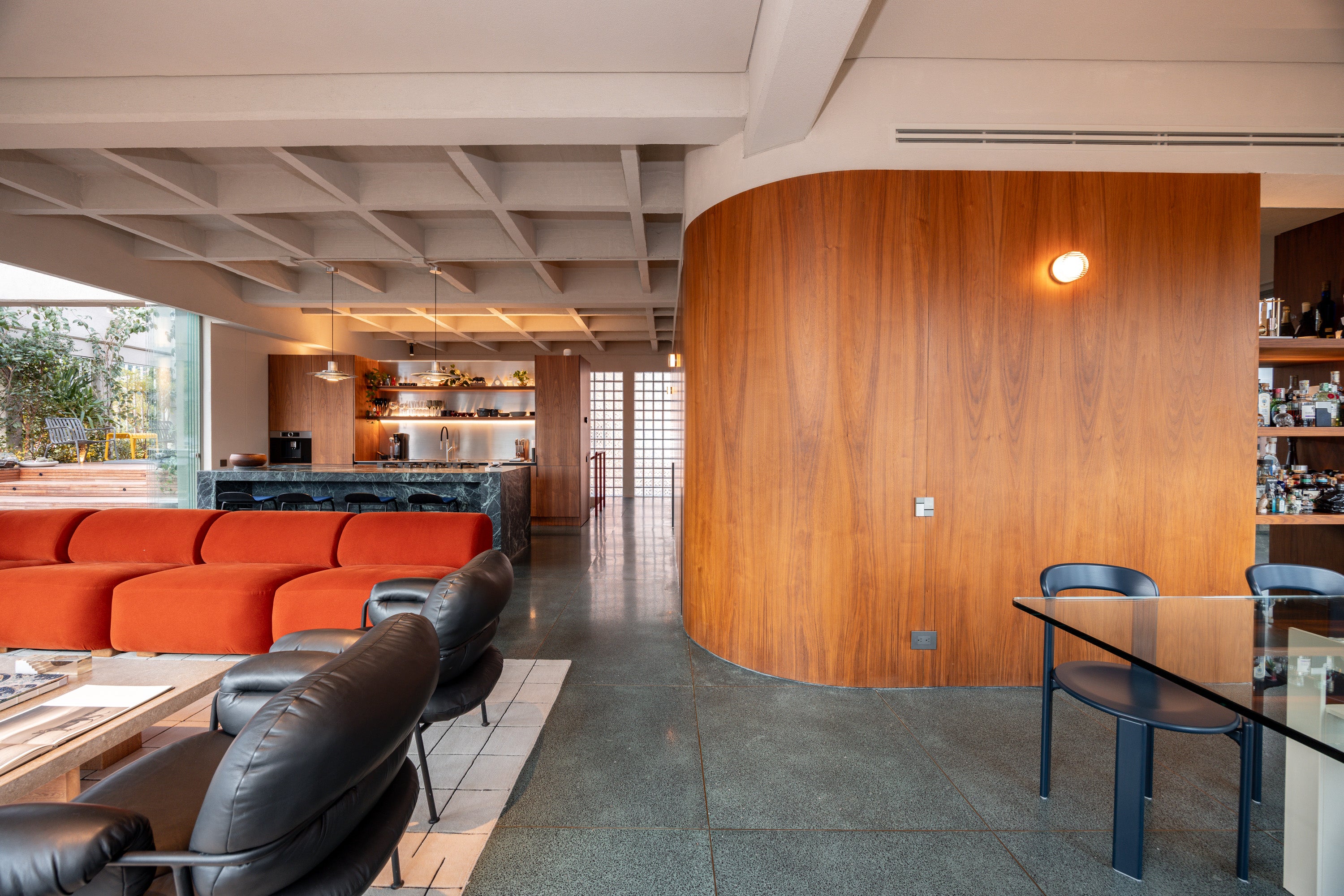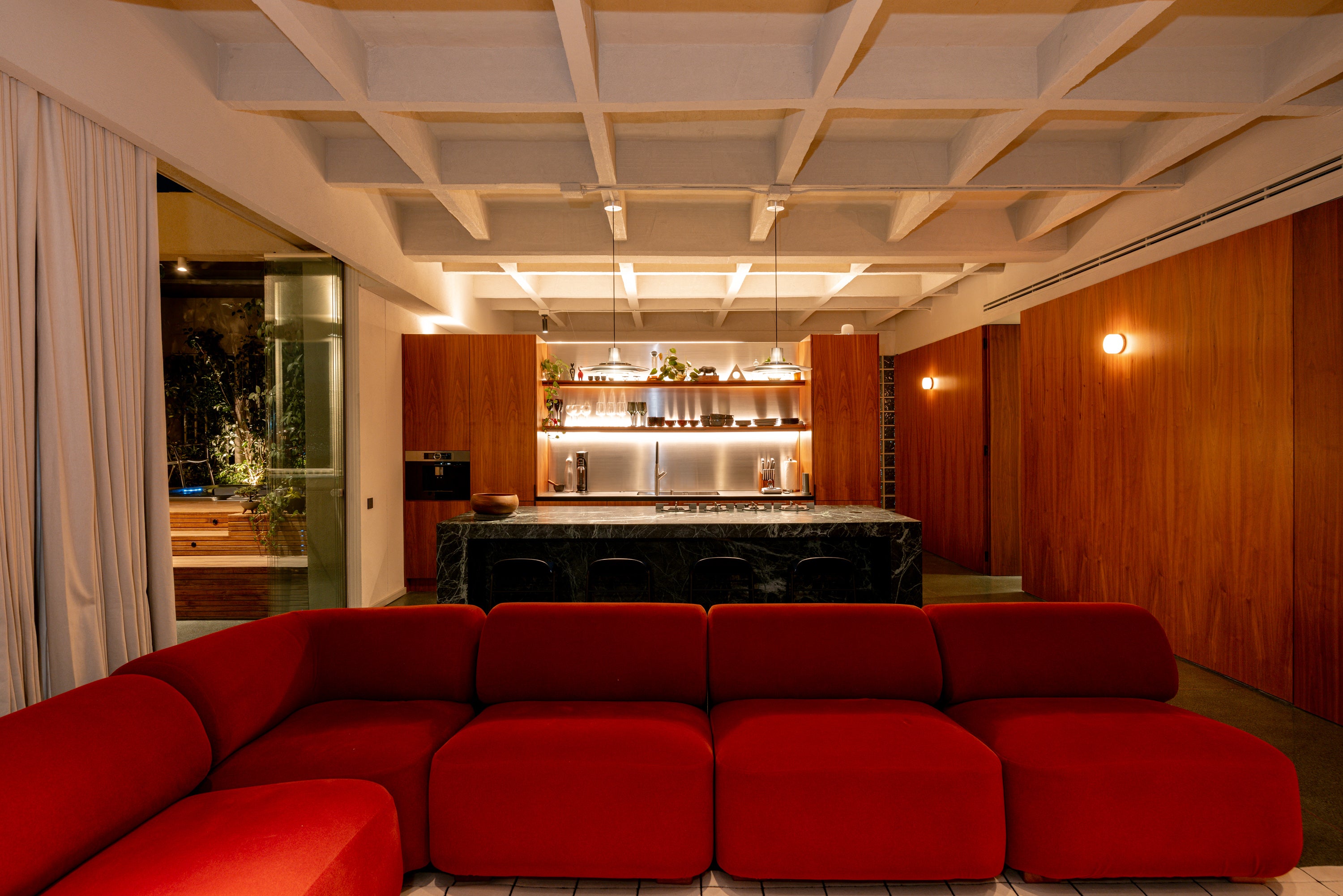• Cocina principal: equipada con isla, acabados en piedra sinterizada y microcemento. Incluye cocina panelable auxiliar.