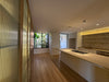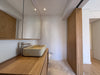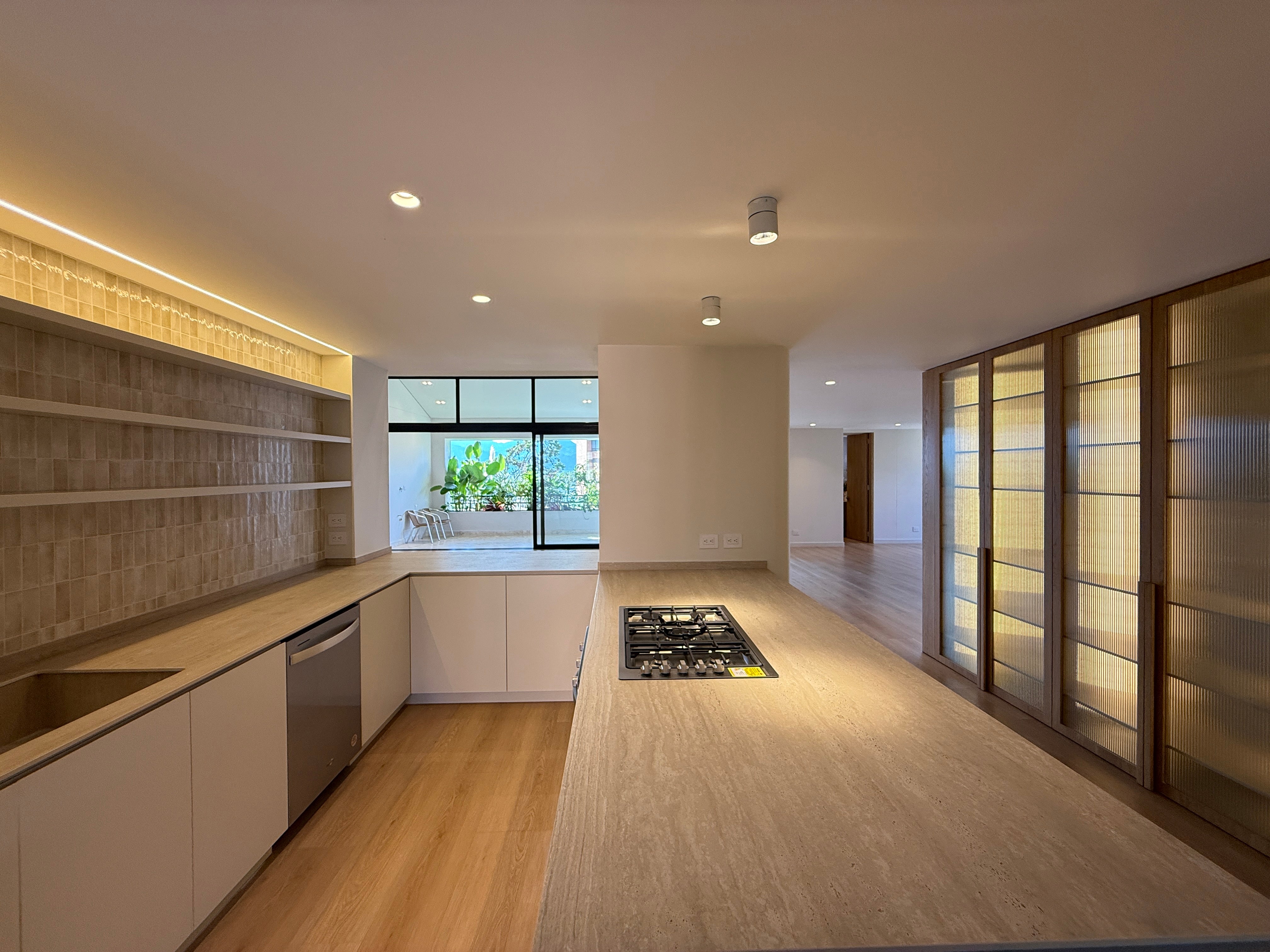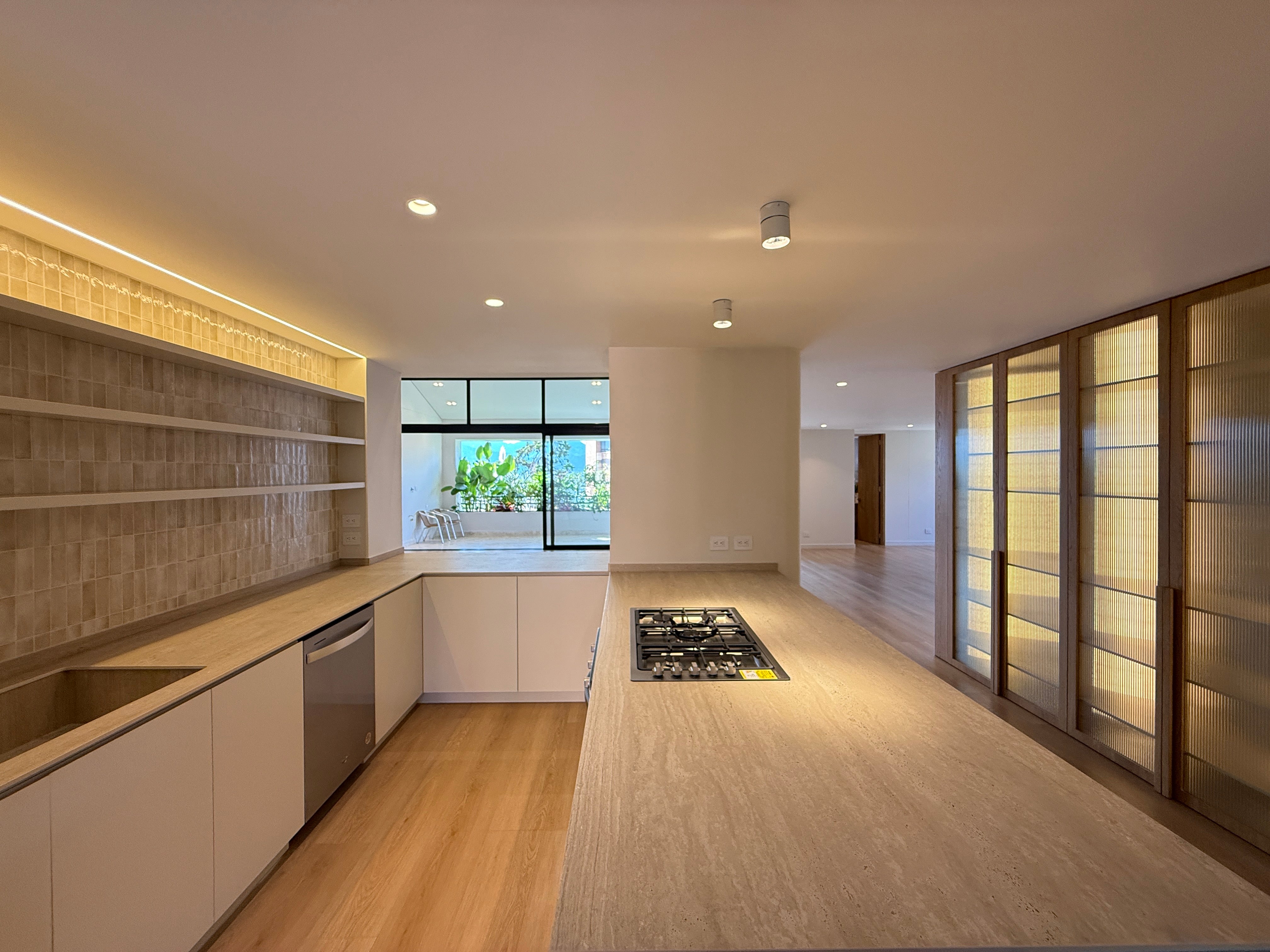 La cocina integrada con mesón en piedra sinterizada nueva se conecta con la zona de ropas, el cuarto del servicio con baño y un práctico clóset de linos.